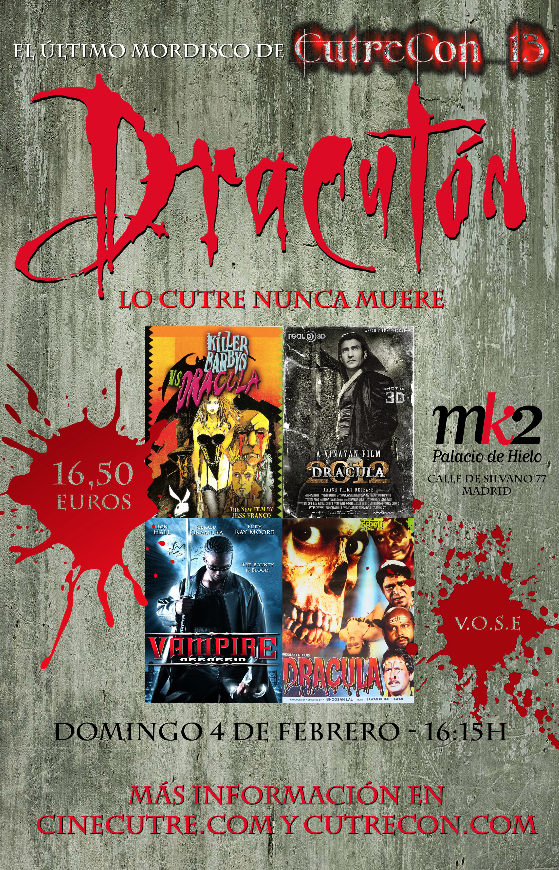 Como es tradición, el festival CutreCon despedirá su decimotercera edición con una intensa maratón final de 4 películas dedicadas al Conde Drácula, con títulos llegados de España, India y Estados Unidos. Los filmes incluidos en la maratón son "Killer Barbys Contra Drácula" (2002), una chifladura de Jess Franco en su etapa más desvergonzada; "Dracula 2012" (2013), un descenso cuesta abajo y sin frenos a los infiernos del CGI más chungo y abismal; "Vampire Assassin" (2005), un plagio de mercadillo dominguero de la saga "Blade"; y "Dracula" (1999), un ejemplo del cine más calamitoso e inepto de la India, rodado en un cementerio de cartón de embalaje con decenas de actores bigotudos que no saben qué hacer ni a dónde mirar.